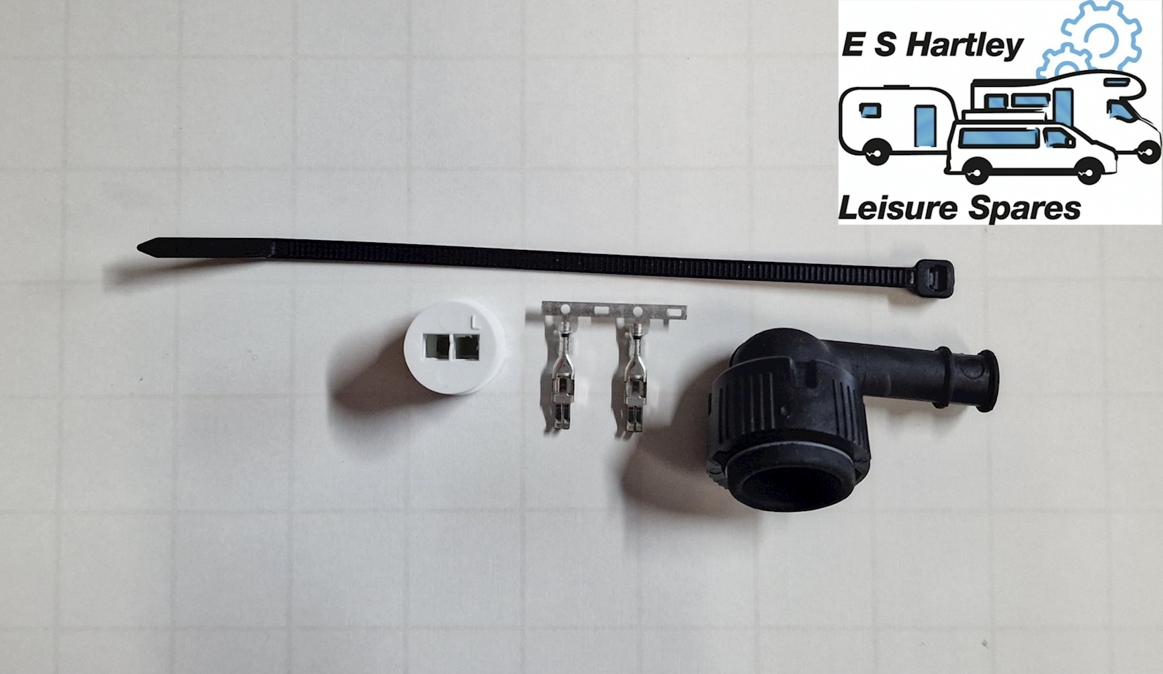 Aspöck 90° connector housing for Flatpoint I LED side marker lights. Includes housing, two crimp contacts, splash-resistant cover, and cable tie for secure installation.